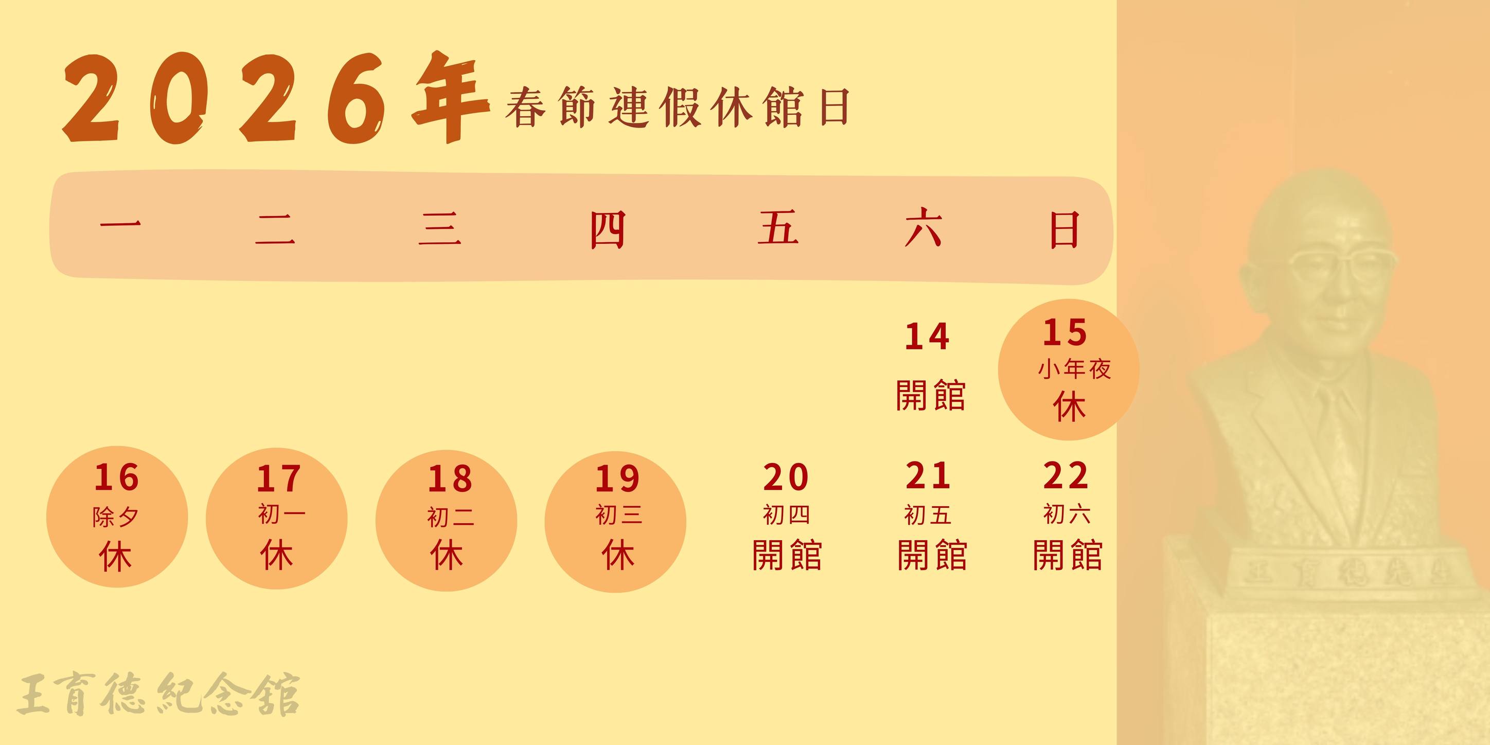 本館2026年春節開閉館日期如下: ・2月15日小年夜(日)起至2月19日初三(四)休館 ・2月20日初四(五)起正常開館 不便處敬請海涵 当館の2026年春節期間の開館日程は、下記の通りです。 ・2月15日(小年夜)~2月19日(旧正月三日)まで休館 ・2月20日(旧正月四日)より通常通り開館いたします。 皆様のご理解とご協力のほど、よろしくお願い申し上げます。